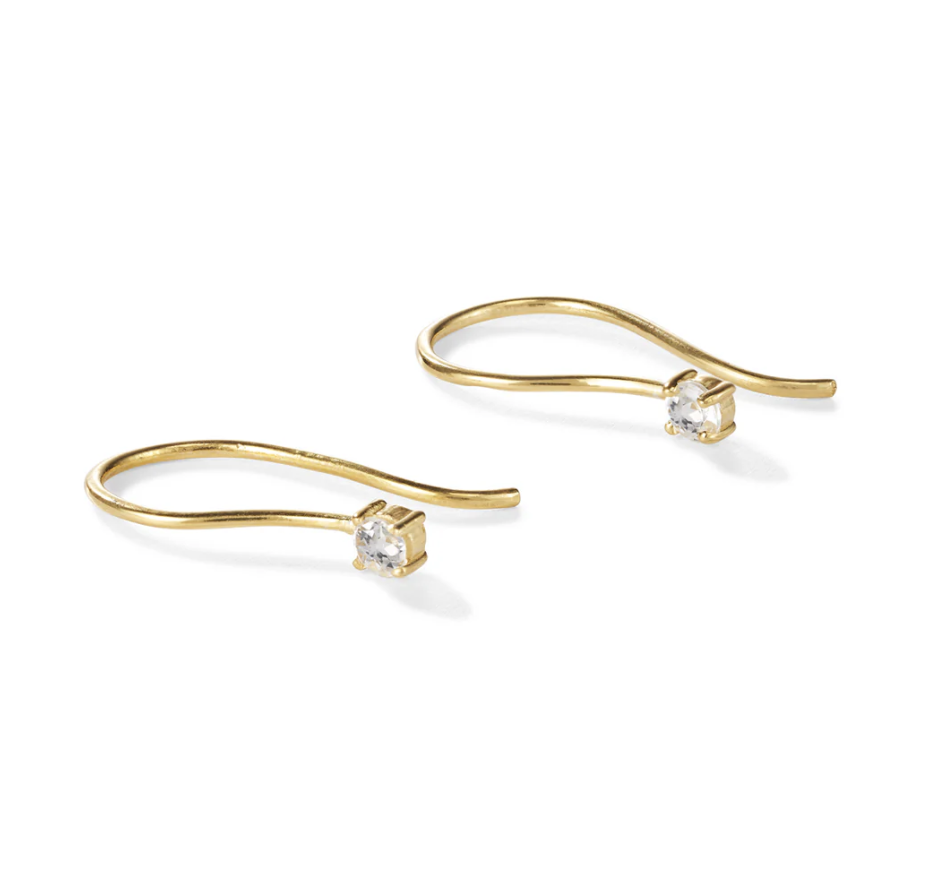 Diese zarten filigranen Ohrringe erinnern an Kreolen und kommen ganz ohne Verschluss aus. Der funkelnde weiße Topas wird von einer zarten Krabbenfassung gehalten. Sterling Silber 24 Karat vergoldet. Der Edelstein Topaz steht für ein zufriedenes glückliches Gefühlsleben und unterstützt die Selbstverwirklichung.